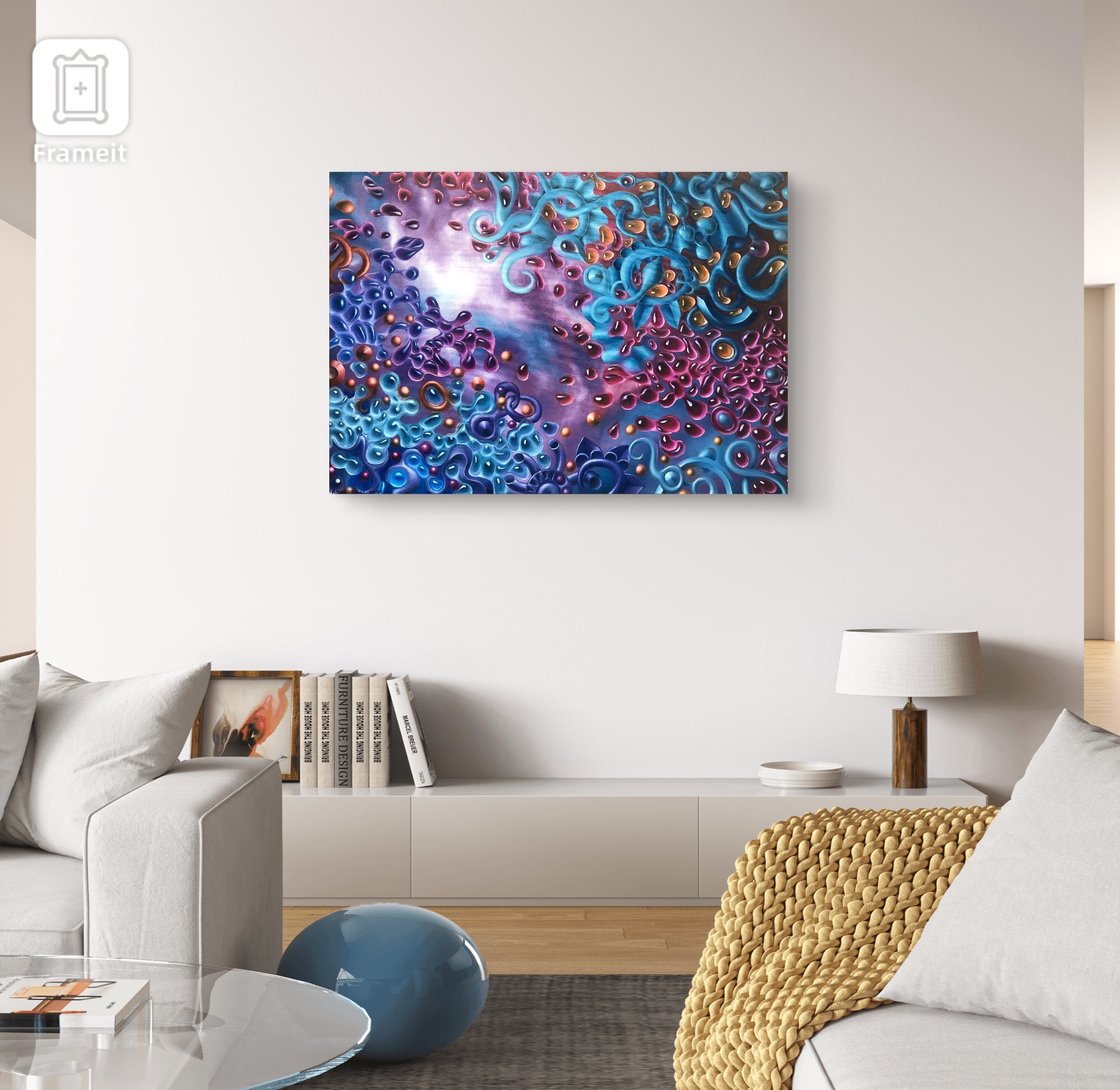 Executed in rich violets, electric blues, and purple tones, the painting balances movement and precision. Every element is deliberate, guiding the eye toward stillness without ever standing still.