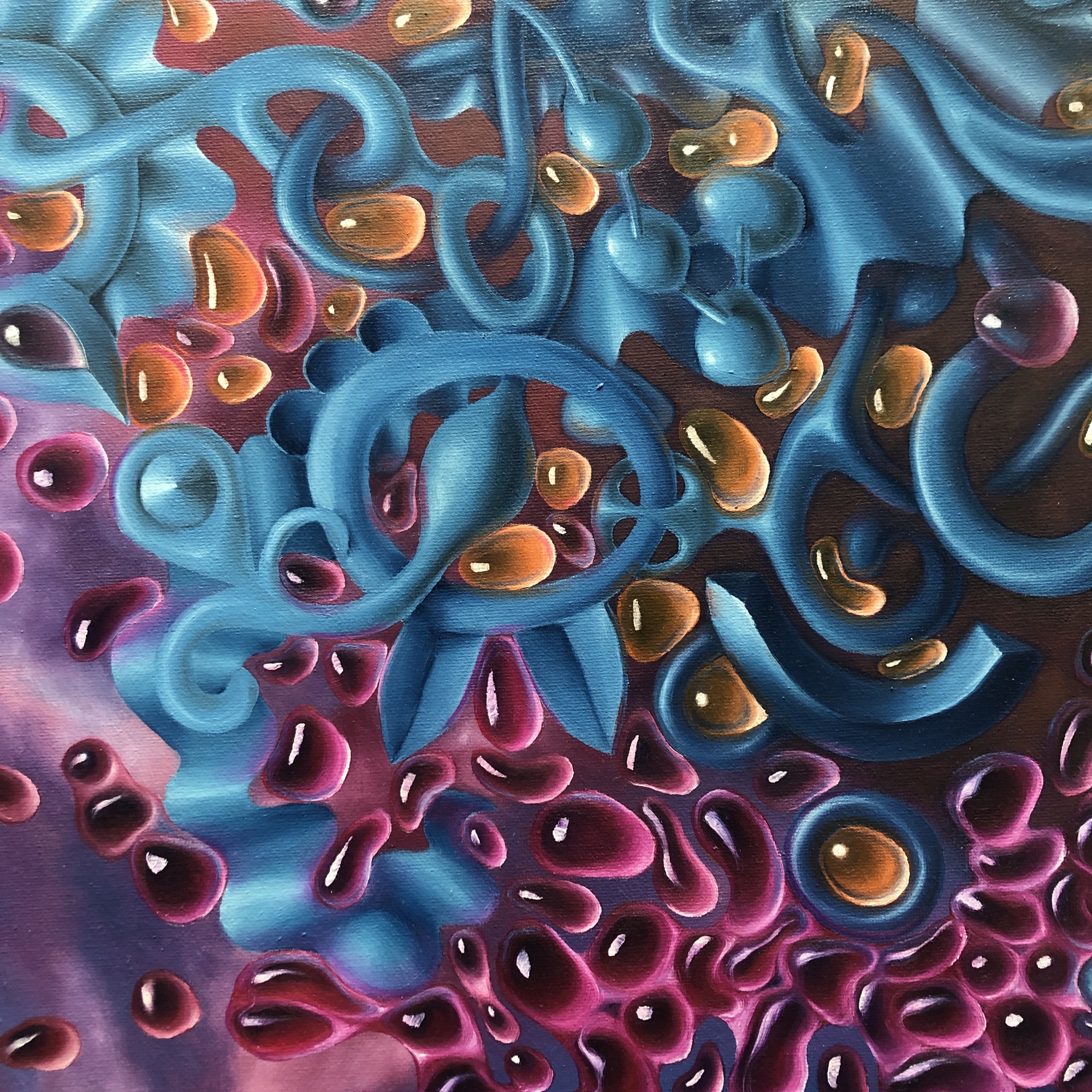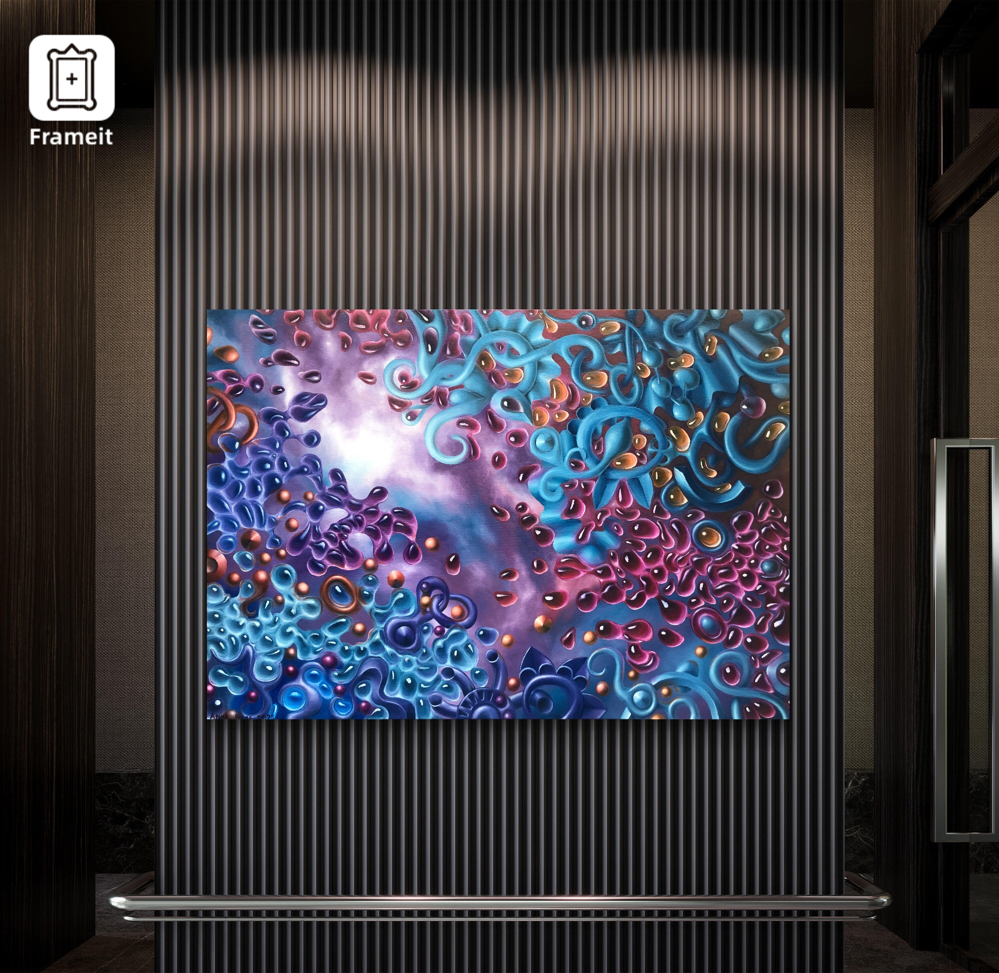 This artwork transforms turbulence into structure. Swirling forms, luminous droplets, and tangled biomorphic shapes push against each other—only to part around a calm, glowing center. The chaos doesn’t dominate; it gives way.